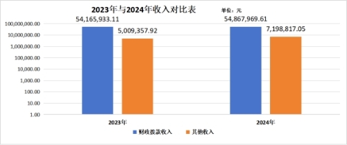与上年相比,收入合计增加2,891,495.63元,增长4.89%。其中:财政拨款收入增加702,036.50元,增长1.30%;无上级补助收入;无事业收入;无经营收入;无附属单位上缴收入;其他收入增加2,189,459.13元,增长43.71%。主要原因是2023年11月食堂刷卡收入确认在2024年。因学生人数较去年增加111人及教师用餐餐标提高,导致全年收入较去年增加。