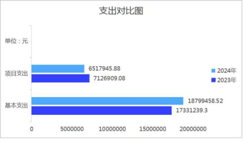 与上年相比,支出合计增加859,256.02元,增长3.51%。其中:基本支出增加1,468,219.22元,增长8.47%,主要原因是,2024年幼儿园外聘教师及幼儿人数增加,故编外教师工资和公用经费增加,在编教师全员调整薪级工资、部分岗位工资增加,社保、公积金调整新基数,故基本支出较上年增加1,468,219.22元;项目支出减少608,963.20元,下降8.54%;上缴上级支出增加0.00元;经营支出增加0.00元;对附属单位补助支出增加0.00元。主要原因是:2024年秋季新增外聘教职工工资补助资金较上年减少454,302.09元,班主任政府目标绩效考核奖经费2024年无此项目,故项目支出较上年减少。