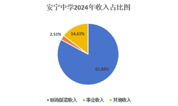 安宁中学2024年度收入合计121,663,597.97元。其中:财政拨款收入100,832,718.07元,占总收入的82.88%;无上级补助收入;事业收入3,050,136.00元(含教育收费3,050,136.00元),占总收入的2.51%;无经营收入;无附属单位上缴收入;其他收入17,780,743.90元,占总收入的14.61%。