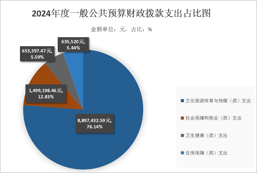 7.文化旅游体育与传媒(类)支出8,897,432.59元,占一般公共预算财政拨款总支出的76.14%,完成年初预算的106.41%。主要用于事业人员工资、津贴、绩效奖金等人员经费支出、机构正常运转日常支出和为完成特定行政工作任务或事业发展目标的专项业务工作经费支出;造成预决算差异的主要原因是:我单位根据安人社调〔2024〕36号调入1人、安人社通〔2024〕22号新招2人,在职转退休4人,年末人数减少1人,导致事业人员支出工资较年初预算减少277,331.00元,事业人员绩效奖励较年初预算减少69,662.00元,融媒体中心保运转项目经费较年初预算增加980,500.00元,一般公用经费支出较年初预算减少109,509.91元,其他支出较年初预算增加11,939.50元,故文化旅游体育与传媒(类)支出较年初预算增加。