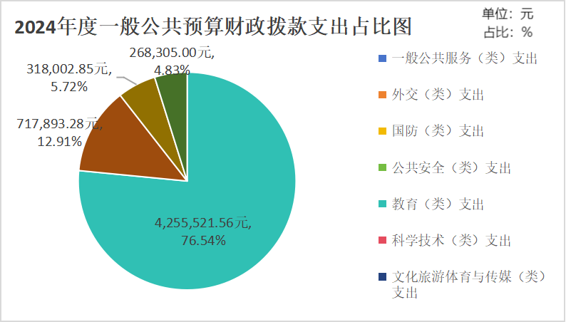5.教育(类)支出4,255,521.56元,占一般公共预算财政拨款总支出的76.54%,完成年初预算的86.94%。主要用于机关事业单位工资福利支出,编外人员工资福利支出,办公费、接待费4,255,521.65元,造成预决算差异的主要原因是2024年在职在编人员调出1人,社保基数调整,社保支出减少,故导致教育(类)支出决算数小于年初预算数。