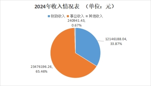 安宁市金方社区卫生服务中心2024年度收入合计35,863,325.73元。其中:财政拨款收入12,146,188.04元,占总收入的33.87%;无上级补助收入;事业收入23,476,196.26元(含教育收费0.00元),占总收入的65.46%;无经营收入;无附属单位上缴收入;其他收入240,941.43元,占总收入的0.67%。