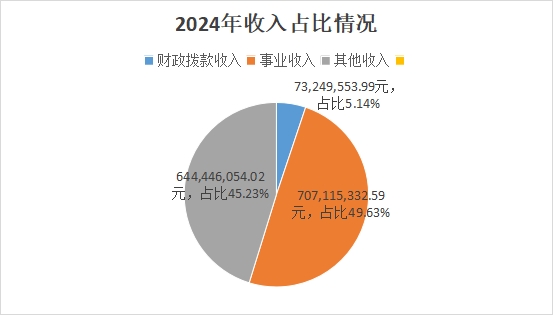 安宁市第一人民医院2024年度收入合计1,424,810,940.60元。其中:财政拨款收入73,249,553.99元,占总收入的5.14%;无上级补助收入;事业收入707,115,332.59元(含教育收费0.00元),占总收入的49.63%;无经营收入;无附属单位上缴收入;其他收入644,446,054.02元,占总收入的45.23%。
