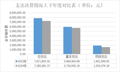 与上年相比,支出合计减少586,722.54元,下降7.45%。其中:基本支出减少239,898.89元,下降4.02%;项目支出减少346,823.65元,下降18.24%。基本支出减少的主要原因是人员经费支出较上年增加182,955.87元,其中2024年一名退休职工死亡,事业单位离退休较上年减少13,600.00元,编内人员和编外人员绩效工资及保险较上年增加196,555.87元,公用经费支出较上年减少422,854.76元,其中使用自有资金支付专用材料费较上年减少600,280.70元,使用自有资金支付劳务费较上年减少110,978.83元,使用自有资金购置专用设备支出较上年增加288,404.77元。项目支出减少的主要原因是一般行政管理事务项目较上年减少5,016.00元,基本药物补助支出较上年增加235,469.37元,基本公共卫生服务支出较上年减少395,468.52元,重大公共卫生服务项目较上年减少635.50元,残疾人康复项目较上年增加38,390.00元突发公共卫生事件应急处置项目较上年减少200,002.00元,其他公共卫生支出项目较上年减少12,000.00元,中医(民族医)药专项较上年减少7,561.00元。