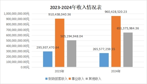 安宁市卫生健康局(汇总)2024年度收入合计1,877,381,764.14元。其中:财政拨款收入265,577,259.55元,占总收入的14.15%;无上级补助收入;事业收入960,428,520.23元(含教育收费0.00元),占总收入的51.16%;无经营收入;无附属单位上缴收入;其他收入651,375,984.36元,占总收入的34.70%。