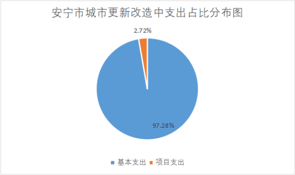 安宁市城市更新改造中心2024年度支出合计962,493.02元。其中:基本支出936,283.02元,占总支出的97.28%;项目支出26,210.00元,占总支出的2.72%;无上缴上级支出;无经营支出;无对附属单位补助支出。