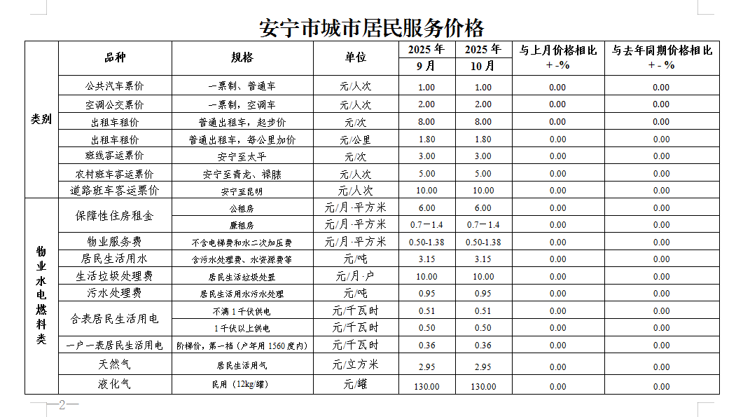 10月份,我市水、电、气、通信、交通、教育、医疗等城乡居民服务性收费价格基本保持稳定。具体价格情况详见附表《安宁市城乡居民服务价格》。