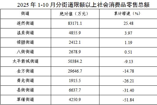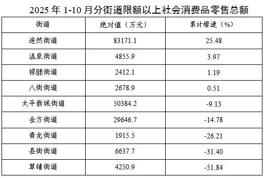 1-10月,限额以上社会消费品零售总额实现正增长的有4个街道,分别为连然街道、温泉街道、禄脿街道、八街街道。