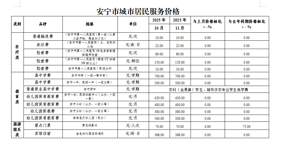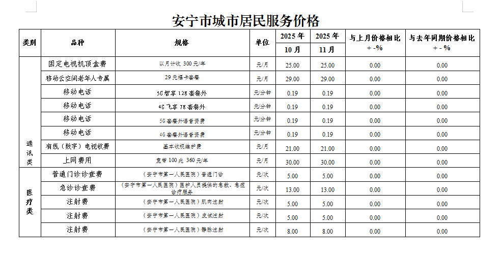 11月份,我市水、电、气、通信、交通、教育、医疗等城乡居民服务性收费价格基本保持稳定。具体价格情况详见附表《安宁市城乡居民服务价格》。