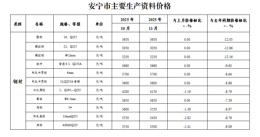 安宁市2025年11月份主要生产资料