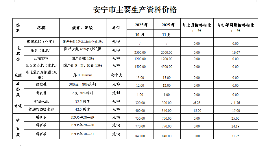 安宁市2025年11月份主要生产资料价格监测情况