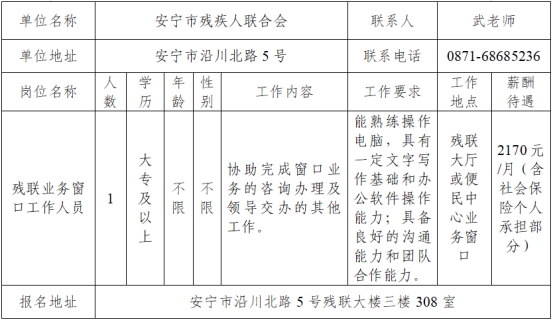 根据《云南省人力资源和社会保障厅 云南省财政厅关于印发云南省城镇公益性岗位管理暂行规定的通知》(云人社通〔2024〕25号)精神,按照公开、公平、公正的原则,现面向社会公开招聘公益岗位人员1名,具体信息如下: