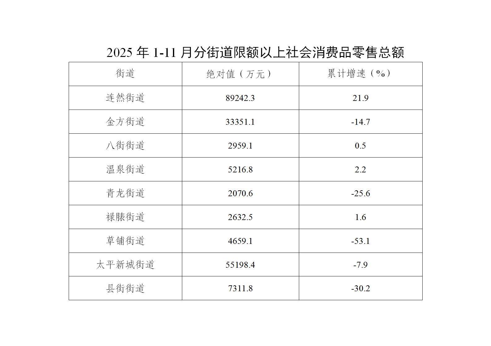 1-11月,限额以上社会消费品零售总额实现正增长的有4个街道,分别为连然街道、温泉街道、禄脿街道、八街街道。其余5个街道为负增长。
