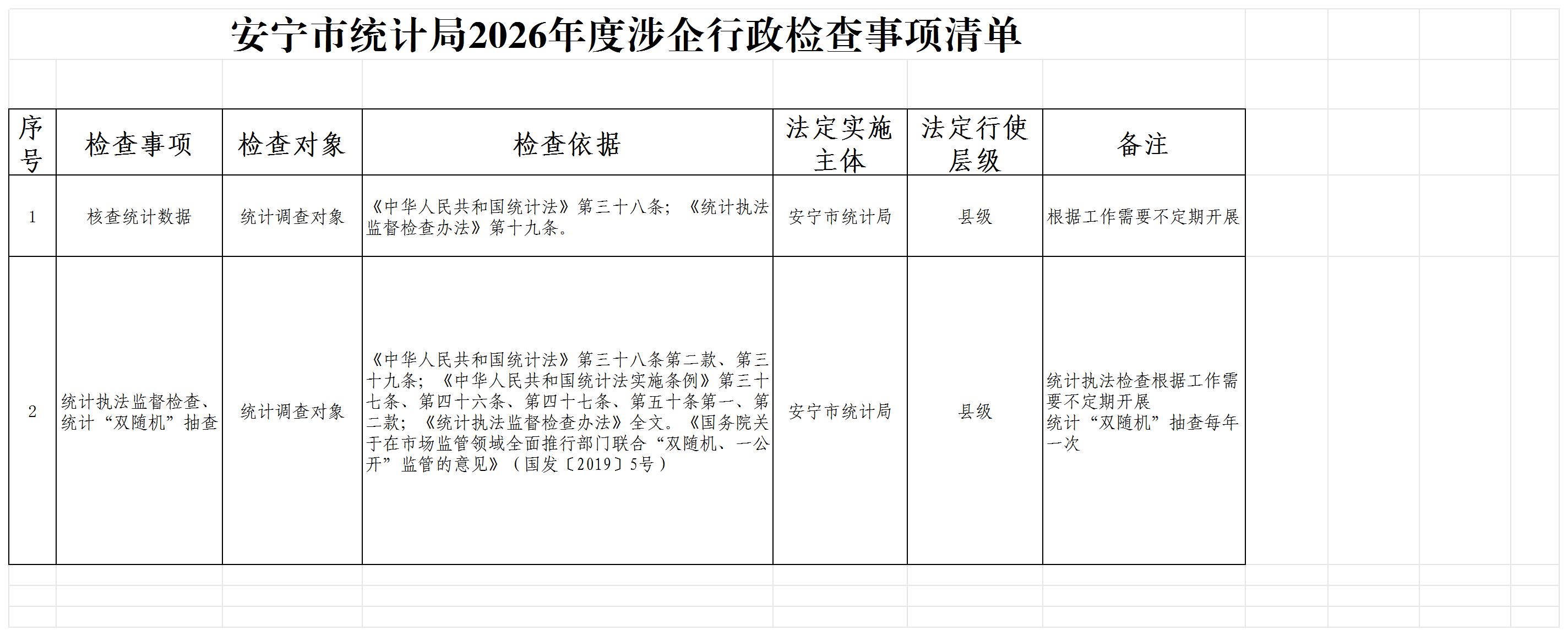 安宁市统计局2026年度涉企行政检查事项清单