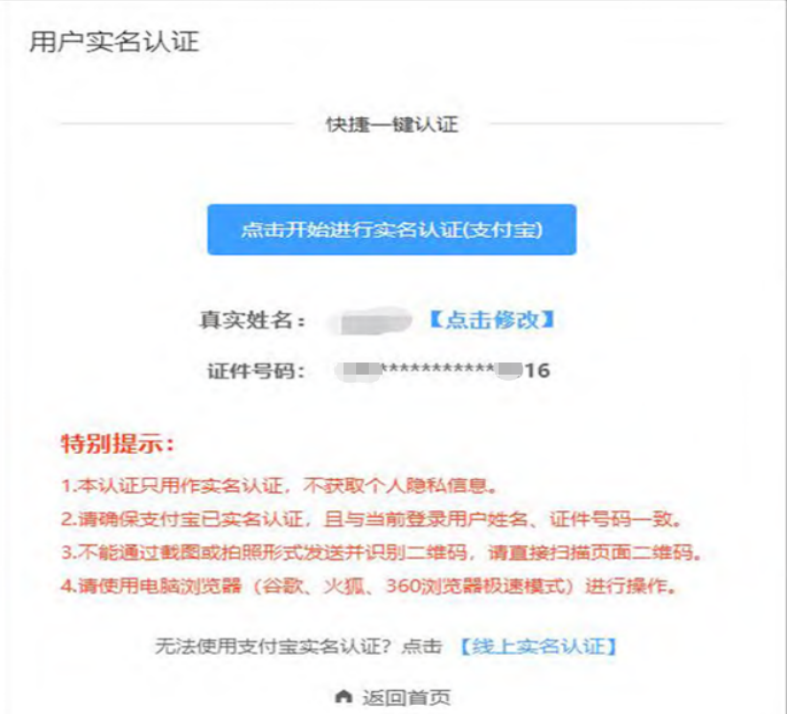全国统一平台提供两种实名认证方式:一是使用本人支付宝账号扫码完成实名认证;二是本人线上实名认证,需上传本人清晰完整的有效身份证件正反面彩色照片及本人手持身份证照片。