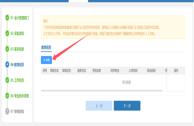 信息采集人员教育经历信息由全国统一平台与中国高等教育学生信息网自动比对,并请及时关注核验结果。自动核验未通过的,需按照“一、信息采集准备材料”中“教育经历证明材料”相关具体要求上传学历、学位证明材料,由属地财政部门进行人工审核。