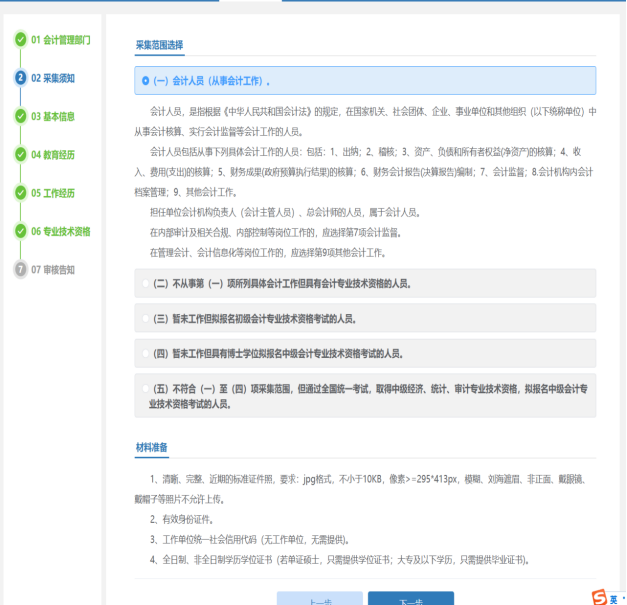 请按“一、信息采集准备材料”要求准备全部五项资料,无专业技术资格证明材料的无需准备。
