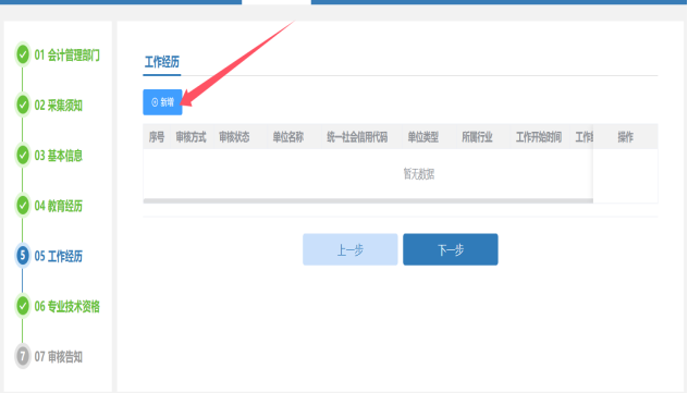 6.填写工作经历。信息采集人员需按《会计工作(经历)证明》模板如实填写相关工作经历信息,并加盖单位公章或人事部门章后拍照上传。模板可通过全国统一平台或本指南附件下载。全日制学历人员在《会计工作(经历)证明》所填的工作开始时间不得早于或等于毕业证“毕业时间”,非全日制学历的人员不受上述限制;会计工作开始时间需与《会计工作(经历)证明》保持一致。