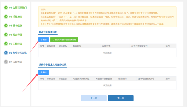 已通过全国会计、审计、统计、经济、税务等专业技术资格考试并取得证书的信息采集人员,按页面要求完整填写相关信息后,由全国统一平台自动核验专业技术资格。自动核验未通过的,需上传本人专业技术资格证书或XX高级评审委员会评审通过证明文件的彩色照片,注册会计师、资产评估师需上传会员证彩色照片,由属地财政部门人工审核。