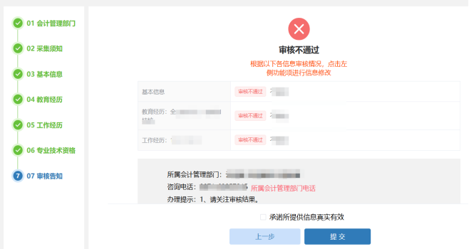 8.采集信息提交。信息采集人员勾选“承诺所提供信息真实有效”并点击提交。后续需关注全国统一平台审核结果。页面显示“审核通过”,说明信息采集流程结束。页面显示“审核未通过”,请按提示补充完善资料后重新提交,如有疑问,请拨打页面公布的咨询电话。