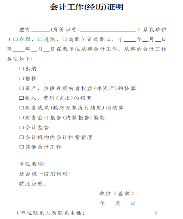 《会计工作(经历)证明》模板可通过全国会计人员统一服务管理平台(以下简称全国统一平台)或本指南附件下载,本人按规定如实填写并加盖单位公章或人事部门章后拍照上传。全日制学历人员在《会计工作(经历)证明》所填的工作开始时间不得早于或等于毕业证“毕业时间”,非全日制学历的人员不受上述限制。从事会计工作或报考会计中级、高级会计专业技术资格考试的人员必须填写上传。无工作单位人员无需填报。