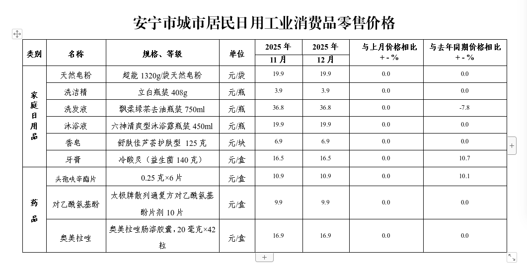 安宁市2025年12月份城市居民日用工业消费品零售价格监测情况