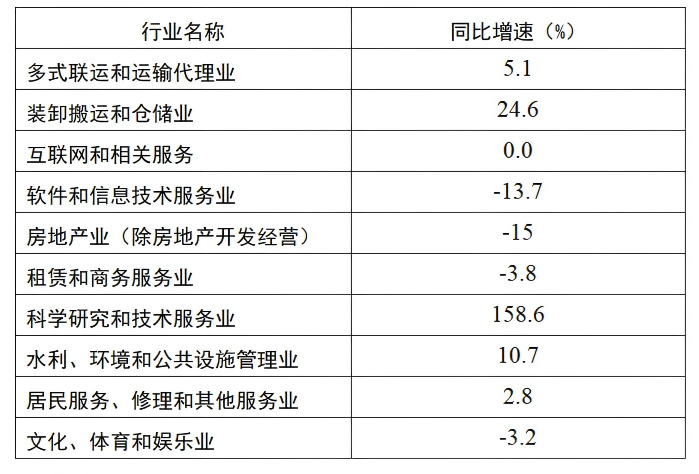 增长行业(增速>10%):科学研究和技术服务业、装卸搬运和仓储业、水利环境和公共设施管理业;