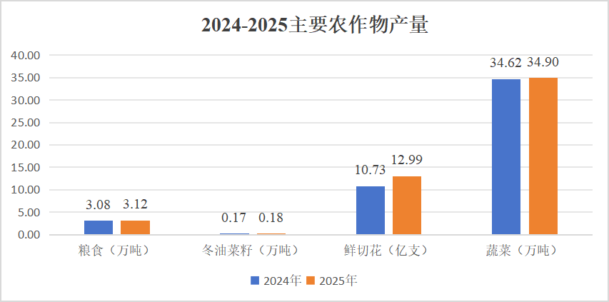 2025年全市农业经济运行呈现鲜明特征:一是产业结构优化升级,增长高度依赖于高附加值的种植业,鲜切花、蔬菜等高效经济作物的快速发展,标志着农业正从传统生产向高效集约模式加速转型。二是增长动能新旧转换,在部分传统养殖业产值波动下调的同时,市场需求旺盛、效益突出的特色种植业占比持续提升,成为新的增长源。三是产业融合进程深化,农林牧渔服务业的快速增长,反映出农业产业链不断拓展,一二三产业融合发展的基础正逐步夯实。总体而言,政策支持为生产提供了稳定环境,而市场机制则有效引导资源配置向高效益领域集中。
