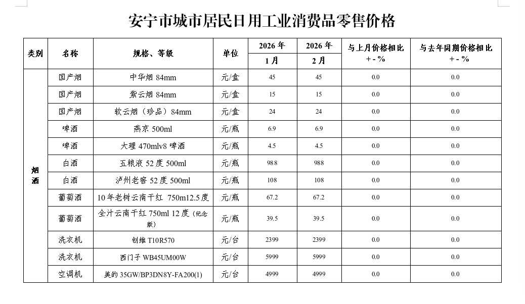 安宁市2026年2月份城市居民日用工业消费品零售价格监测情况